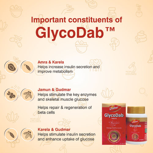Dabur Glycodab Tablet is a research product developed by CCRAS. Enriched with the goodness of amla, karela, jamun, gudmar, this tablet helps to manage healthy sugar levels. Amla and karela help increase insulin secretion while improving metabolism. Jamun and gudmar help stimulate the key enzymes and skeletal muscle glucose and also help repair and regenerate beta cells. These tablets also help stimulate insulin secretion and enhance the uptake of glucose.